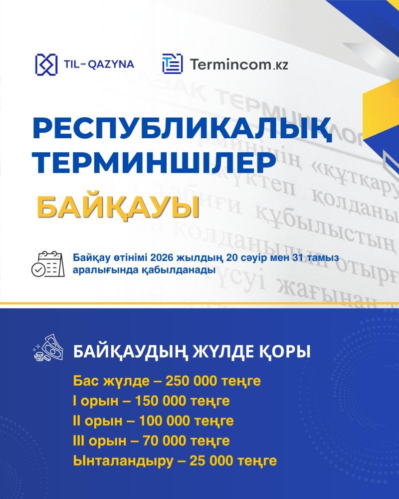 Қазақстан Республикасы Тіл саясаты комитеті, Ш. Шаяхметов атындағы «Тіл-Қазына» ұлттық ғылыми-практикалық орталығы жыл сайынғы республикалық терминшілер байқауын бастады! Байқау өтінімі 2026 жылдың 20 сәуір мен 31 тамыз аралығында қабылданады.