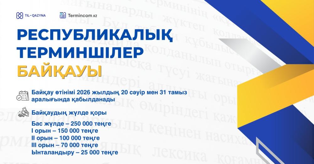 Қазақстан Республикасы Тіл саясаты комитеті, Ш. Шаяхметов атындағы «Тіл-Қазына» ұлттық ғылыми-практикалық орталығы жыл сайынғы республикалық терминшілер байқауын бастады! Байқау өтінімі 2026 жылдың 20 сәуір мен 31 тамыз аралығында қабылданады.